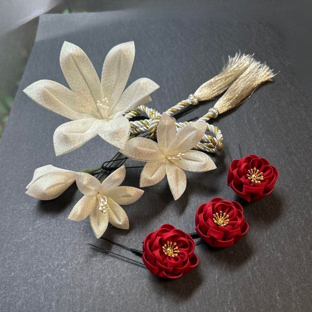 華結び ― 白百合と椿 -金彩|成人式 髪飾り つまみ細工 白×赤 振袖・卒業式・結婚式におすすめ 和装ヘアアクセ(S054)